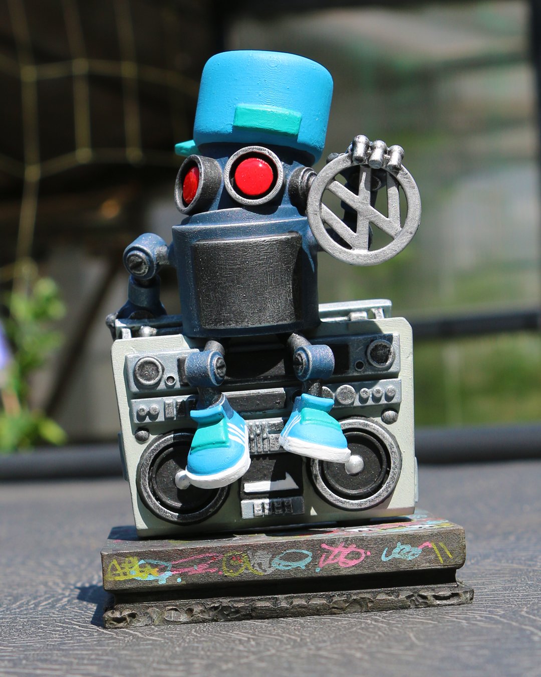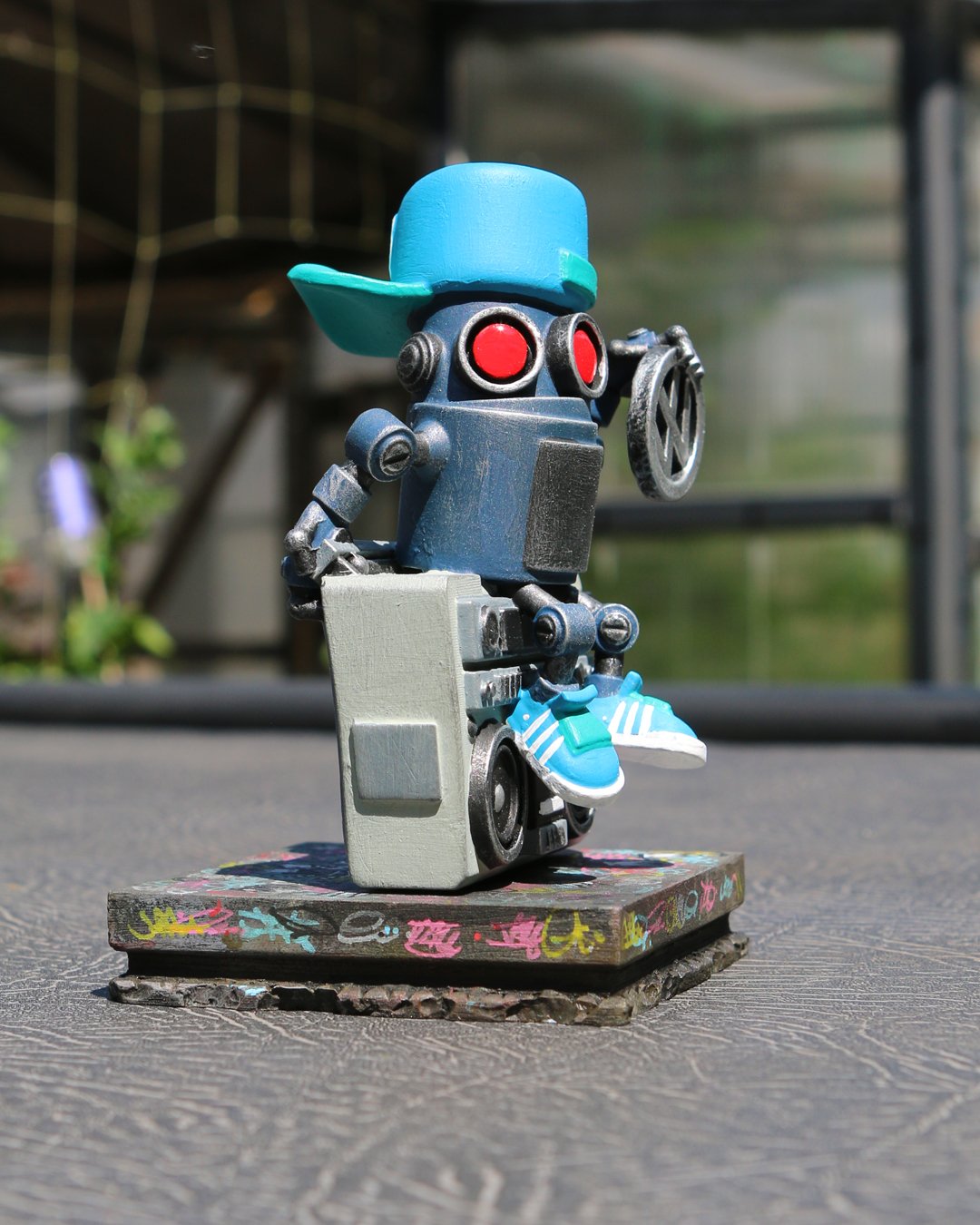 Introducing the latest UMEDROID sat on top of his boombox complete with removable base. This 2 piece collectable has been painted in a striking dark blue and cyan colour way, the base has been made to look like damaged concrete covered in graffiti. It stands over 5 inches tall and is signed on the base.